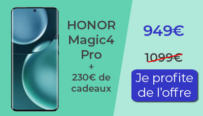 Avec des caractéristiques incroyables et des performances impressionnantes, le tout dernier smartphone premium d'Honor, le Magic 4 Pro voit son prix baisser grâce à une offre promotionnelle proposée par le constructeur lui-même ! Une remise immédiate de 150€, qui s'appliquera après la mise au panier du téléphone, fait baisser le prix de Magic 4 Pro de 1099€ à 949€. En plus de cette réduction, Honor vous offre également deux cadeaux qui accompagneront à merveille votre nouveau smartphone. Recevez comme premier cadeau une paire d'Honor Earbuds 3 Pro, des écouteurs sans fil parfaits pour écouter votre musique, d'une valeur de 199.90€.