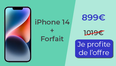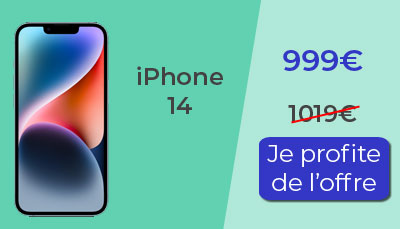 Vous trouverez également l'iPhone 14 Pro en promotion. Avec un forfait mobile, achetez l'iPhone 14 Pro à 1199€ au lieu de 1329€. Économiser 130€ sur l'achat de l'iPhone 14 Pro. Si vous ne souhaitez pas souscrire à une nouveau forfait, l'iPhone 14 Pro est à 1299€ au lieu de 1329€.