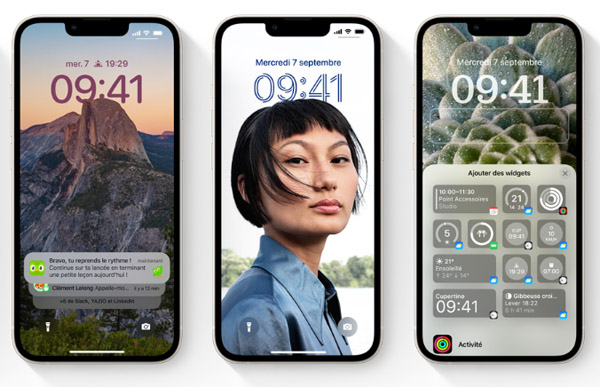 L’une des principales nouveautés d’iOS 16 est la possibilité de personnaliser l’écran de verrouillage. Il est désormais possible de choisir la police de caractère de l’horloge et on peut y ajouter plusieurs widgets se rapportant aux applications idoines afin d’avoir certaines informations seulement en saisissant le mobile. Apple propose plusieurs modèles de photos pour le fond de l’écran de verrouillage avec la possibilité de faire passer des éléments graphiques derrière certains objets des photos pour un rendu plus fun.