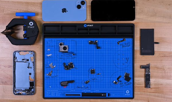 Le bilan du site iFixit donne une note de 7/10 à l’iPhone 14 pour sa réparabilité. Ce score est obtenu notamment grâce à sa nouvelle conception interne et en prenant en compte le fait de pouvoir démonter « soi-même » l’appareil. Cette note ne doit pas être confondu avec l’indice de réparabilité qui, englobe des critères plus larges comme le fait de prendre en compte toute la chaîne de la réparation via les réparateurs tiers dont la disponibilité et les prix des pièces détachées.