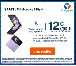 La première chose à faire pour profiter de ce bon plan, c’est de souscrire à un forfait Sensation 90 Go, 170 Go ou 240 Go de Bouygues Telecom lors de la commande de votre nouveau smartphone. Vous bénéficierez alors automatiquement d’une grosse remise immédiate pouvant atteindre plusieurs centaines d’euros.