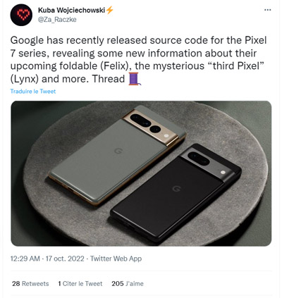 Alors que les nouveaux smartphones Google Pixel 7 et Pixel 7 Pro sont à peine disponibles, plusieurs sources semblent converger vers le fait que le géant américain pourrait prochainement étoffer cette série avec l’arrivée sur le marché de deux autres téléphones. Le premier d’entre eux serait un Pixel 7 Mini. Des éléments repérés dans le code source de la série Pixel 7 feraient référence à deux appareils à venir qui portent les noms de code Felix et Lynx. Le « Felix » est le nom de code du Pixel Fold dont nous avons déjà entendu parler, même récemment. Le « Lynx » pourrait être le nom de code du Pixel 7 Mini ou du Pixel 7 Ultra. Toutefois, plusieurs choses penchent en faveur du premier, le Pixel 7 Mini. En effet, le code suggère que l’écran du « Lynx » serait identique à celui qui est installé au sein des Pixel 6, Pixel 6a et Pixel 7. Il serait effectivement assez peu probable que le Pixel 7 Ultra, qui serait la version la plus aboutie et donc la mieux équipée reçoive un écran qui ne soit pas meilleur, au moins au niveau de celui du Pixel 7 Pro. Il est également possible que le nom de code « Lynx » fasse référence à un Pixel 7a qui pourrait être abordable et succéder à l’actuel Pixel 6a.