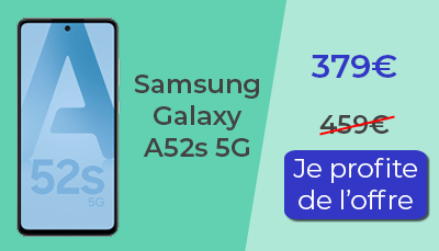 Et cette semaine, il est en promotion grâce à la Samsung Week ! C'est donc le moment idéal de se procurer ce bon smartphone pour pas cher et passer à la vitesse 5G ! Son prix passe de 459 € à seulement 379 €. En plus, bénéficiez d'une remise pour la reprise de votre ancien smartphone pour faire passer le prix de ce smartphone sous la barre des 300 €. Par exemple, vous souhaitez passer de votre ancien A51 au A52s, vous pouvez bénéficier de 80€ de remise et ainsi faire passer le prix du smartphone à seulement 299 € !