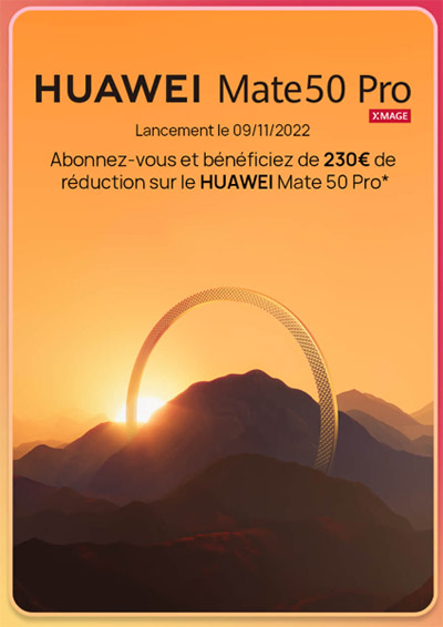 Le nouveau smartphone haut de gamme Huawei Mate 50 Pro sera lancé officiellement le 9 novembre prochain et alors disponible en précommande. Toutefois, vous avez la possibilité de vous inscrire dès aujourd’hui, et ce jusqu’au 9 novembre à 9h59 pour profiter d’une offre spéciale. Celle-ci vous permet de bénéficier d’une réduction de 230 € sur le prix du smartphone Huawei Mate 50 Pro. La première étape consiste à vous inscrire. Vous recevez ensuite un code promotionnel personnel d’une valeur de 230 € par e-mail. Entre le 9 novembre 2022 à 10h et le 31 décembre 2022 à 23h59, vous pouvez acheter le Mate 50 Pro avec le code promo et bénéficier de la remise. Proposé à 1199 €, cette opération vous permet de l’avoir pour un prix de 969 €.