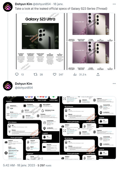 Officiellement, la nouvelle série de smartphones Samsung Galaxy S23 doit avoir lieu le 1er février prochain. Elle est composée des modèles Galaxy S23, Galaxy S23+ et Galaxy S23 Ultra. De nombreuses rumeurs se sont fait entendre tout au long de l’année dernière et récemment des visuels définitifs ont été publiés sur les réseaux sociaux, terminant de dévoiler leur design respectif. Pour les caractéristiques techniques, là aussi, les rumeurs allaient bon train et la quasi-totalité de leurs fiches techniques respectives se dévoilait et s’affinait au fil des mois. Une fois n’est pas coutume, la fuite provient de documents émanant de Samsung France qui ont, semble-t-il, été récupérés et divulgués par Dohyun Kim @ dohyun854 sur le réseau social Twitter.