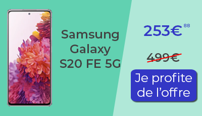 Le Samsung Galaxy S20 FE 5G est un smartphone haut de gamme abordable sorti par Samsung en Septembre 2020. Il possède de très bonne qualité et est plus performant que des smartphones récents dans sa gamme de prix. Son superbe écran AMOLED, ses très bonnes performances et sa caméra 4K seront parfaite pour vous accompagner quelques années. Le principal argument du S20 FE 5G est son prix désormais ! Dernièrement, il était au prix de 499€ mais Rakuten casse le prix de ce smartphone pour le faire passer à seulement 253,88€ ! Une promotion folle de 50% pour ce smartphone haut de gamme, une offre idéale pour se faire plaisir avec un budget restreint.