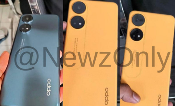 Le Reno8T serait décliné en finition similicuir orange noir ou bleu. Ses capteurs photo sont installés dans deux cercles noirs au dos, alignés verticalement.