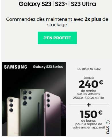 - enfin, en choisissant l'iconique Galaxy S23 Ultra, profitez de 180 € de remise immédiate pour le modèle 512 Go et 240 € pour la version 1 To !