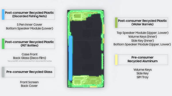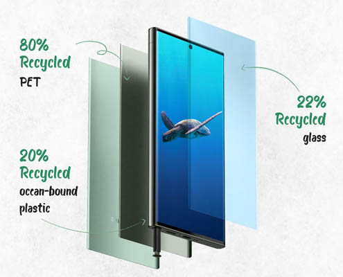 Le Galaxy S22 Ultra intégrait 6 composants internes en matériaux “écologiques”. Le nouveau smartphone Galaxy S23 Ultra en utilise 12, internes et externes, incluant des matériaux recyclés. Il profite de la protection Corning Gorilla Glass Victus 2 qui utilise 22% de verre recyclé au niveau de l’écran mais également de la partie arrière de l’appareil. Le panneau arrière, sous la protection, est conçu à partir de 80% de plastique recyclé. Celui-ci est issu des filets de pêche. L’emplacement de rangement du stylet S Pen a un revêtement fait de 20% de plastique recyclé. Samsung annonce que le téléphone est facile à réparer.