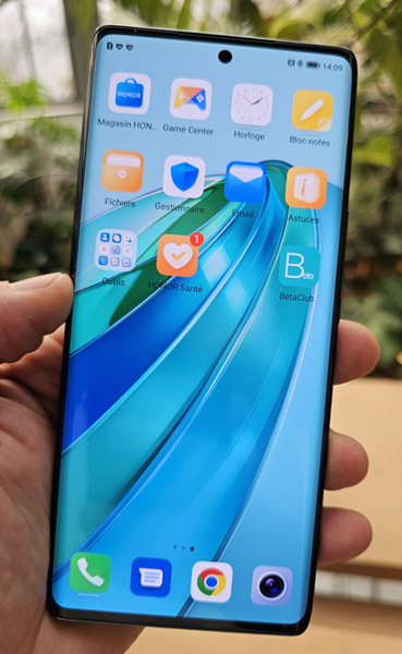 Le smartphone Honor Magic5 Lite est le téléphone mobile le plus fin au monde embarquant une batterie d’une capacité de 5100 mAh. Il fait 7,9 mm de profil. Son poids n’est seulement que de 175 grammes et on peut apprécier des profils effilés notamment grâce à un dos qui revient dessus ainsi que son écran incurvé. Celui-ci à une diagonale de 6,67 pouces sur une dalle AMOLED. Elle profite d’une fréquence de rafraîchissement maximum de 120 Hz et d’une luminosité maximale de 800 cd/m², selon Honor. Il revendique un taux d’échantillonnage tactile de 300 Hz, de quoi prendre l’avantage dans les jeux. Il affiche une définition de 1080x2400 pixels. L’écran est protégé contre les rayures, mais également les chocs. Il ne s’agit pas de la technologie Corning Gorilla Glass, mais d’une autre, d’un niveau équivalent, toujours selon la marque, qui permettrait au téléphone d’offrir une résistance accrue. Toujours au sujet de l’écran, on peut compter sur un traitement anti-jaunissement et différentes fonctions d’optimisation de l’affichage. Le lecteur d’empreinte digitale se trouve en dessous de l’écran.