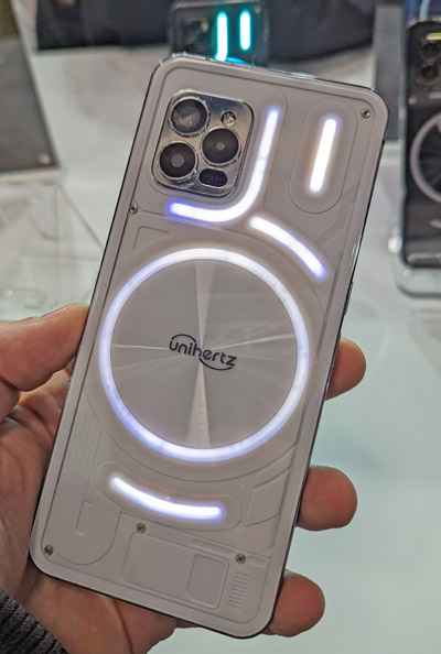 Pour concevoir leurs appareils, certaines marquent partent d’une feuille blanche alors que d’autres s’inspirent des autres modèles déjà disponibles chez la concurrence. Il semble que cela soit le cas de la société chinoise Unihertz qui a profité du salon MWC 2023 de Barcelone pour exposer sa dernière « création », le smartphone Luna. Celui-ci était exposé sur le stand de la marque et on peut dire qu’il a attiré les regards. En effet, présentés de dos, plusieurs exemplaires illuminaient fièrement leur surface arrière, comme le Nothing phone (1), sorti il y a quelques mois déjà et qui semble remporter un certain succès. Les LED au dos sont plus nombreuses mais aussi beaucoup moins bien finis que sur le modèle de Nothing. Elles peuvent s’animer lors de l’arrivée d’une notification ou battre le rythme de la musique jouée par l’appareil.