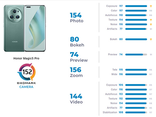 Honor renouvelle son segment du haut de gamme avec le Magic5 Pro qui est aussi accompagné d’un modèle plus abordable, le Magic5 Lite, le Magic5 n’étant pas commercialisé en France. Récemment, le Magic5 Lite a été reconnu par le laboratoire DxOMark comme étant le mobile proposant la meilleure batterie avec la plus grande autonomie. Le Magic5 Pro a aussi été testé par DxOMark et il a obtenu le meilleur score, à ce jour, soit 152 pour la qualité de ses photos mais aussi de ses vidéos surclassant le Huawei Mate 50 Pro jusqu'ici considéré comme la référence. Rappelons qu'il y a encore à peine deux ans, Honor appartenait à Huawei volant maintenant de ses propres ailes et, pour le coup, plus haut que son ancienne maison-mère. Son écran a aussi été largement testé et l’appareil a réussi à décrocher un score de 151 surpassant le 149 obtenu par l’iPhone 14 Pro Max, se classant premier.