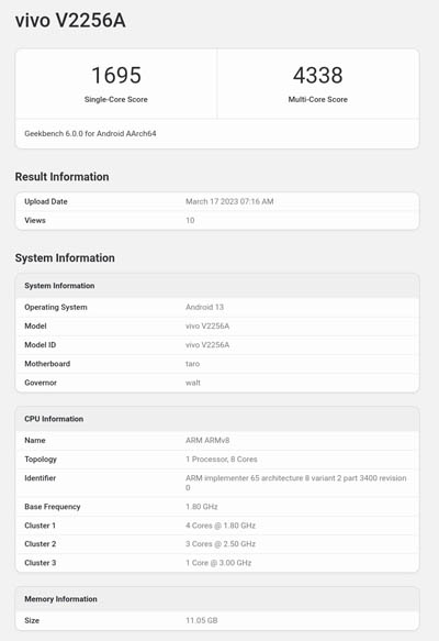 Les premières rumeurs concernant le Vivo X Flip faisaient état de la présence d’un processeur Qualcomm Snapdragon 8+ Gen 1. Le fait qu’il ait été testé et plus particulièrement avec l’application de mesures de performances brutes Geekbench. Il porte le numéro de référence V2256A. Il obtient un score de 1695 pour les tests mono coeur et 4338 pour les tests multi coeurs. On peut voir sur la fiche de résumé du test que l’appareil est animé par le système Android 13 de Google. Il profite de 12 Go de mémoire vive. Le processeur envisagé est confirmé. En effet, il s’agit bien du Snapdragon 8+ Gen 1 développé par Qualcomm.