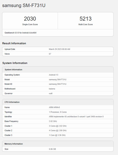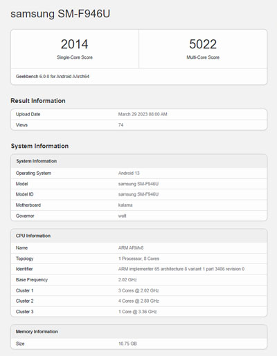 La marque Samsung doit présenter officiellement les successeurs des Galaxy Z Fold4 et Galaxy Z Flip4 dans le courant de cet été. La production de masse des Galaxy Z Fold5 et Galaxy Z Flip5 devrait prochainement débuter. Il semble que les premiers exemplaires soient opérationnels puisque les résultats de test réalisés depuis l’application de mesure de performances Geekbench viennent d’être publiés sur le site de Geekbench. En effet, lorsqu’un mobile est ainsi testé, les résultats sont publics et cela permet notamment de savoir si l’appareil essayé et performant ou pas et quels sont certains de ces composants qui l’animent.