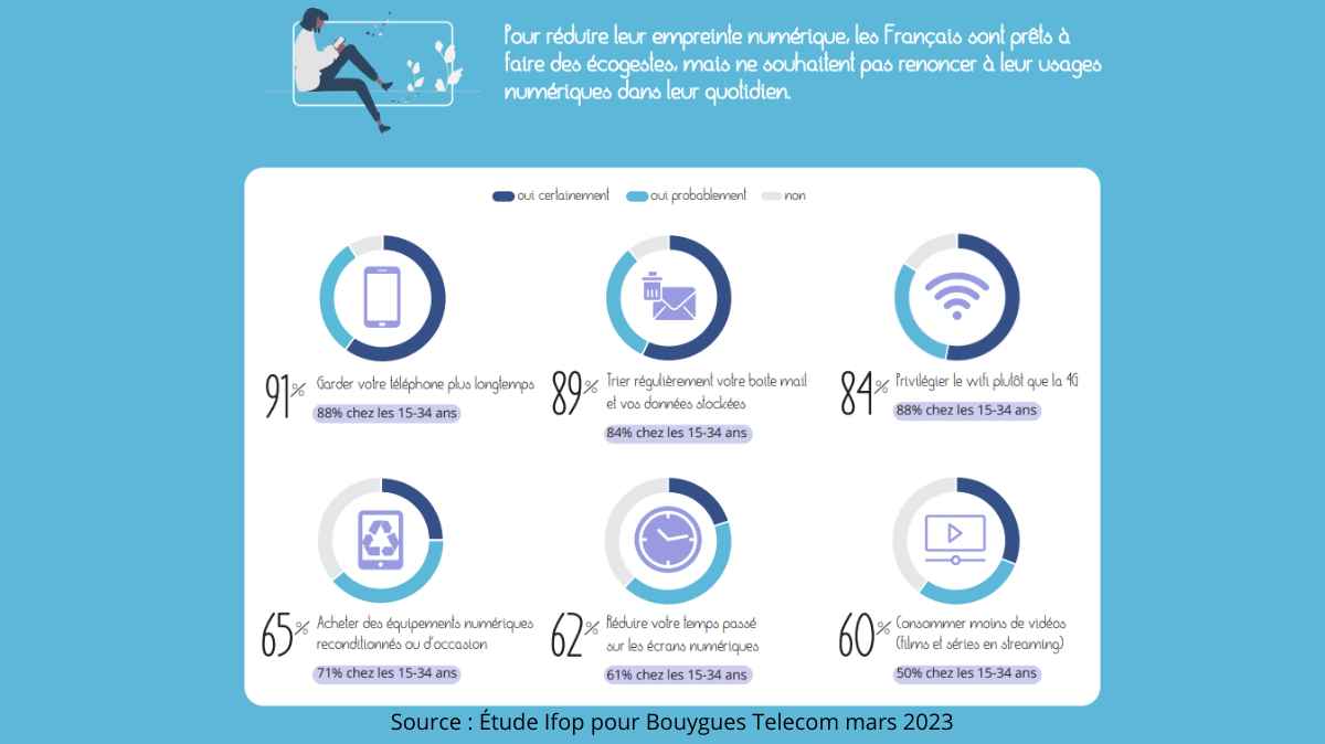 De plus en plus de Français sont prêts à faire des éco-gestes pour réduire leur empreinte numérique. Selon une étude réalisée par IFOP, 62% des Français sont attentifs à limiter leur utilisation des technologies numériques. Et c’est chez les jeunes que la tendance est la plus forte : 65% d’entre eux sont concernés par cette pratique.