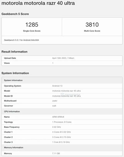 Le smartphone portant le numéo de modèle Motorola XT2321-1 qui pourrait porter le nom commercial de Motorola Razr 40 Ultra, comme indiqué sur la fiche publiée par le site Geekbench a été testé le 16 avril 2023. Il est animé par Android 13. Il est équipé d’une puce Qualcomm Snapdragon 8+ Gen 1, correspondant à la configuration mentionnée dans la fiche. On apprend également que le mobile est doté de 8 Go de mémoire vive. Il est possible qu’une autre version avec 12 Go de RAM soit également proposée.