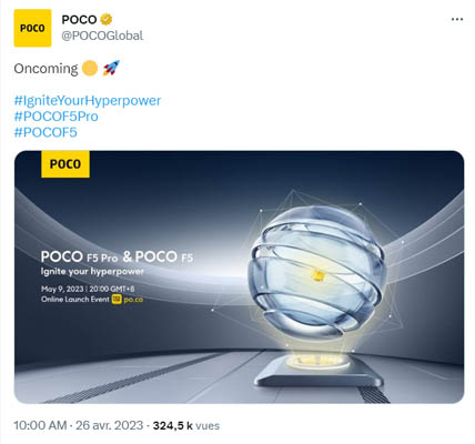 Le POCO F5 mais aussi le POCO F5 Pro feront, si on en croit le Tweet du compte @POCOGlobal, l’objet d’une présentation officielle le 9 mai prochain.