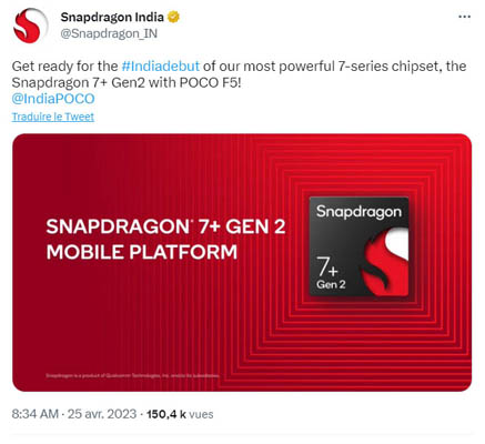 Tout début janvier 2023, Xiaomi présentait les nouveaux smartphones Redmi K60 pour le marché chinois. Cette nouvelle série était pressentie pour être renommé POCO F5 pour les marchés internationaux. C’est par l’intermédiaire du compte Twitter Indien Snapdragon que l’on apprend que le POCO F5 sera équipé de la nouvelle puce Qualcomm Snapdragon 7+ Gen 2. Il s’agirait du premier modèle à en profiter. Ce processeur est gravé en 4 nm par TSMC, à l’origine de très nombreux chipsets pour différents appareils, pas nécessairement que des smartphones. Il dispose d’un module Wi-Fi 6 et promet 50% de performances en plus par rapport au Snapdragon 7 Gen 1 et 13% d’efficience en plus.