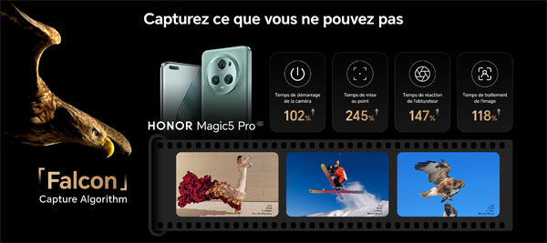 Le nouveau smartphone Honor Magic5 Pro est disponible. Pour son mobile haut de gamme, la marque a intégré la technologie Falcon Capture qui s’appuie sur nouveau traitement d’image, Image Engine Honor. Cette technologie profite d’un tout nouvel algorithme de capture en millisecondes, permettant d'atteindre des vitesses de capture parmi les plus rapides du marché, et de repousser les limites de la clarté de l'image. Pour ce faire, Honor a créé ses propres laboratoires consacrés aux appareils photo afin d'effectuer des analyses quantitatives et qualitatives, qui ont servi de base au développement de son algorithme d'intelligence artificielle. Le smartphone présente notamment une vitesse de mise au point automatique en hausse de 245 % par rapport à la génération précédente, selon Honor.