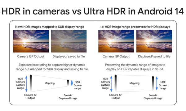 Ce format s’appellera Ultra HDR et sera rétro-compatible avec les contenus JPEG, selon Google. Les photos prises avec ce format seront enregistrées en 10 bits HDR et pourront être visionnées en l’état sur les smartphones compatibles fonctionnant sous Android 14. Le géant américain a même précisé que l’application Google Photos supportera le format Ultra HDR pour l’affichage, la sauvegarde, l’édition, le partage ainsi que le téléchargement.