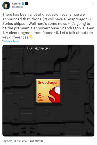 Lors du dernier salon MWC 2023 de Barcelone, Carl Pei créait la sensation en annonçant la signature d’un accord avec la société Qualcomm en vue de la fourniture d’un chipset pour son prochain smartphone Nothing phone (2). Depuis les rumeurs vont bon train pour savoir de quel modèle il s’agit précisément. C’est via Twitter que le co-fondateur de la marque a annoncé que le Nothing phone (2) sera équipé d’un processeur Qualcomm Snapdragon 8+ Gen 1. En outre, une toute petite partie du dos du smartphone a été dévoilée.