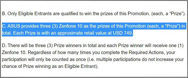 Maintenant, bien avant sa présentation et donc la mise en ligne d’une page qui pourrait lui être dédié, le prix du Zenfone 10 a été vu sur le site officiel de la marque, divulgué de manière accidentelle. Plus précisément, il a été aperçu dans les pages des conditions générales du concours organisé par la société pour tenter de gagner... un Zenfone 10 par tirage au sort. La page mentionne la valeur au détail approximative de l’appareil qui est de 749 dollars.