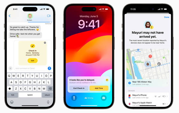 Sous iOS 17, l’application Messages est améliorée grâce à l’intégration de filtres dans les recherches et la possibilité, dans un groupe, d’afficher les derniers messages non lus en premier. La réponse à un texto est aussi plus simple puisqu’accessible depuis un balayage de l’écran. Toujours dans l’application Messages, la nouvelle fonction Check In permet d’envoyer à vos contacts une notification si vous n’êtes pas arrivé chez vous, par exemple. En cas d’absence de réponse, des informations sur votre dernière position ainsi que votre niveau de batterie sont également transmis à vos contacts privilégiés.