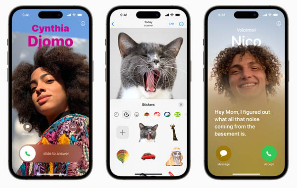 Au sujet des contacts, le carnet d’adresses propose une nouvelle fonctionnalité baptisée Posters. Il s’agit de présenter les fiches de contact sous un affichage plus agréable que les informations classiques, avec une grande photo qui s’affiche en plein écran sur le mobile de votre correspondant lorsque vous l’appelez. Il est possible d’ajouter des emojis ainsi que de différentes typographies. Une transcription en direct pour les messages vocaux est également prévue. En outre, on peut aussi laisser un message sur FaceTime. En plus, l’application Téléphone pourra répondre à certains appels à votre place et retranscrire le texte à l’écran.
