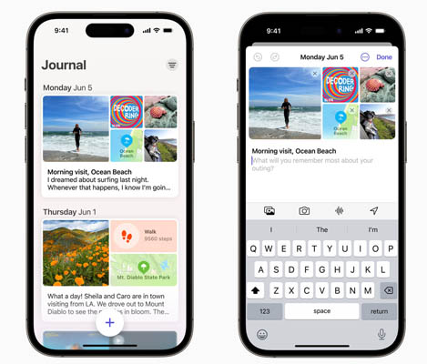 iOS 17 propose une nouvelle application nommée Journal. Celle-ci permet de créer des notes personnelles et suggère automatiquement des moments importants de la vie en y ajoutant des photos, de la musique et des activités. Il est possible de planifier des événements. Le tout est entièrement sécurisé avec un chiffrage complet.