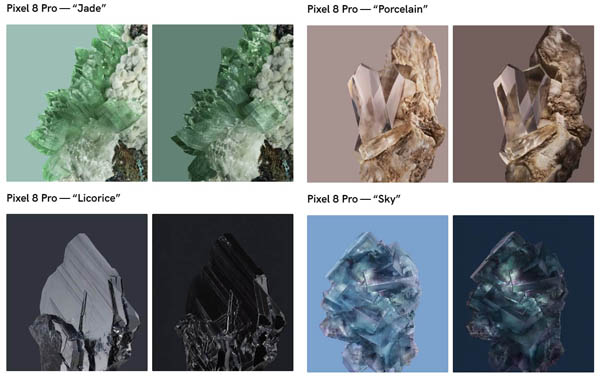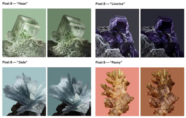 Concernant les fonds d’écran, qui sont nouveaux pour chaque nouvelle série depuis le Pixel 6, Google a, semble-t-il privilégié le thème des minéraux. Cela donne une collection d’images aux couleurs des coques des différents modèles. Chaque teinte aura donc droit à son fond d’écran avec un minéral particulier avec, pour chacune, une version claire et une version sombre.