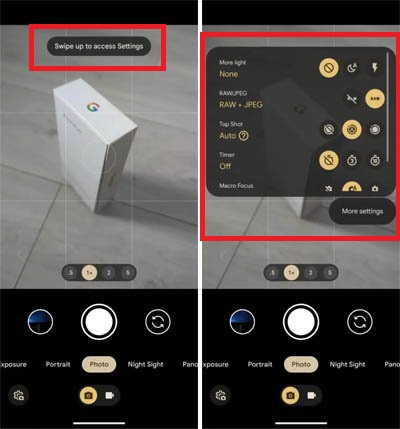 D’autres ajustements ont été apportés à l’application Google Camera, tels que la nécessité de faire glisser son doigt vers le haut pour accéder au menu des paramètres, ainsi qu’un nouveau bouton de paramètres situé en bas à gauche de l'écran.