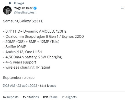 Ainsi, selon une personne bien renseignée et à l’origine de plusieurs fuites qui se sont révélées exactes, il semblerait que le smartphone Samsung Galaxy S23 FE soit équipé d’un écran AMOLED de 6,4 pouces avec une définition de 1080x2400 pixels et une fréquence de rafraîchissement de 120 Hz au maximum. Il embarquerait une batterie ayant une capacité de 4500 mAh et pouvant supporter la charge à 25 watts. Il serait capable de se recharger sans fil. Le mobile serait également certifié IP68 donc pourrait résister à une immersion sous l’eau ou à la poussière, comme ses aînés.