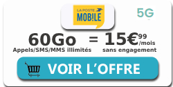 La Poste Mobile est l'opérateur de La Poste en partenariat avec SFR. Cela veut dire que le réseau utilisé par les forfaits pas chers de La Poste Mobile est celui de SFR. Parmi ces forfaits, il est possible sur plusieurs d'entre eux de souscrire pour 5 € de plus par mois à l’option 5G. C'est le cas avec leu forfait proposant 60 Go à 10,99 € qui peut donc devenir un forfait 60 Go en 5G pour 15,99 €. En plus de vos 60 Go en France métropolitaine, la formule vous donne accès à 12 Go que vous pourrez utiliser en Europe et dans les départements d'Outre-Mer. De plus la formule vous donne accès à des appels, SMS et MMS illimités en France et vers la France depuis l’UE et les DOM. Autre avantage, la Poste étant présente partout sur le territoire physiquement, le SAV est facilement accessible. En ce moment, La Poste Mobile offre les 4 premiers mois d'abonnement à l'ensemble de ces forfaits sans engagement.