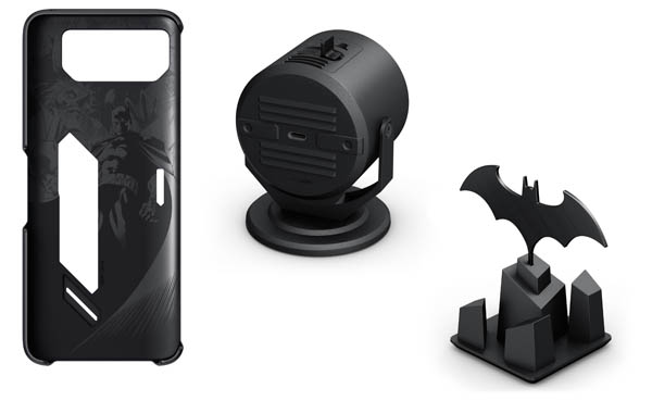 Le smartphone est livré dans un package spécial. Il comprend le téléphone, bien entendu, mais également des accessoires dans le thème Batman. Il y a notamment une coque de protection « Aero Case » Batman, un mini-projecteur Bat-Signal, un outil d’extraction Batarang avec support sur le thème de la ville de Gotham City ainsi qu’un étui de rangement avec une poignée pour être facilement transporté ou exposé.