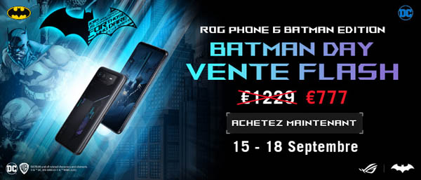Le smartphone Asus ROG Phone 6 Batman Edition va l’objet d’une vente flash exceptionnelle du 15 septembre jusqu’au 18 septembre 2023 sur le site Asus Store. Ce modèle exclusif est proposé à un prix de 777 € au lieu de 1229 €, ce qui correspond à une réduction de 452 €.
