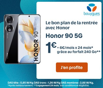Juste en souscrivant un forfait mobile chez Bouygues Telecom lors de l’achat de votre Honor 90 5G, vous pouvez cassez complètement son prix en profitant de plusieurs réductions et avantages successifs.