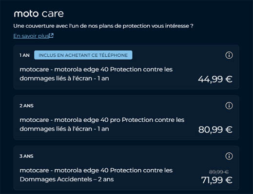 Certains smartphones sont concernés par cette offre moto care. Lors de l’achat, sur le site Motorola, il suffit de choisir l’un des plans de protection proposés. Par exemple, pour le Motorola edge40, le fabricant propose 1, 2 ou 3 ans de garantie pour des prix respectifs de 44,99 €, 80,99 € et 71,99 € (en promotion à l’heure de l’écriture de ces lignes).