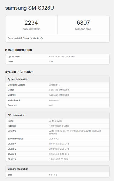 Outre les performances du processeur, la fiche de résultat de Geekbench a également dévoilé quelques détails supplémentaires sur le Galaxy S24 Ultra. On peut y voir que le smartphone sera livré avec Android 14 préinstallé et dispose de 8 Go de RAM. De plus, on s'attend à ce que le processeur Snapdragon 8 Gen 3 ait une configuration comprenant un cœur CPU Cortex-X4 cadencé à 3,3 GHz, trois cœurs CPU Cortex-A720 cadencés à 3,15 GHz, deux cœurs CPU Cortex-A720 cadencés à 2,96 GHz, et deux cœurs CPU Cortex-A520 cadencés à 2,27 GHz.