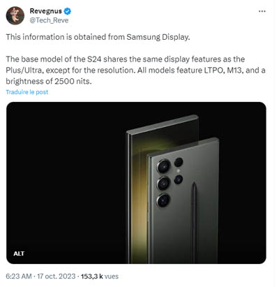 Comme beaucoup de smartphones, les prochains Galaxy S24 font l’objet de rumeurs. La dernière en date est jugée assez crédible au regard des révélations qui se sont avérées exactes de son auteur. Ainsi, @Tech_Reve a publié un message sur le réseaux social X (anciennement Twitter) mentionnant des informations qui proviendrait du fabricant de panneaux AMOLED pour les smartphones, Samsung Display. Selon l’intéressé, le géant sud-coréen aurait décidé d'intégrer sa technologie la plus récente dans les trois modèles, et non plus seulement dans l'Ultra, comme c'était le cas les années précédentes.