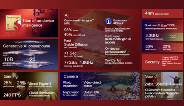 Le module Sensing Hub intégré dans le chipset de Qualcomm permet de sécuriser l'accès à des données personnelles telles que les activités préférées, le niveau de forme physique et la localisation, pour fournir des réponses d'assistant AI plus précises. L'IA améliore également les capacités de l'appareil photo, notamment en utilisant la segmentation sémantique afin d’améliorer la netteté et les détails des images en temps réel, ainsi que la vision nocturne pour éclaircir les scènes sombres. De plus, la puce offre une fonction d'effacement d'objets pour les vidéos, une vue Vlogger pour capturer à la fois des vidéos à partir de l'appareil photo selfie et de l'appareil photo arrière, ainsi qu'une expansion de photo à l'aide de l'IA générative. L'amélioration de la plage dynamique (HDR) est également au programme.