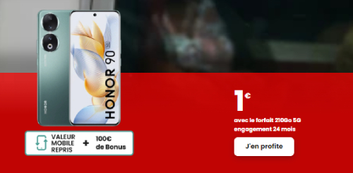L'opérateur SFR propose en ce moment une offre promotionnelle exceptionnelle vous permettant de profiter du smartphone Honor 90 au prix de 1€ avec le forfait 210Go 5G ! Ce téléphone mobile dispose d'un écran AMOLED de 6,7 pouces et se présente en deux coloris : noir et vert. Il est doté d'un processeur Snapdragon 7 Gen 1 et d'une RAM de 12Go, de quoi vous garantir une expérience de navigation qualitative, aussi fluide que rapide ! D'ailleurs, le smartphone Honor 90 est compatible avec le réseau 5G.