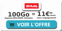 Chez Syma Mobile, vous pouvez souscrire au forfait 100Go à 11,99€ par mois. Ce forfait illimité et sans engagement vous offrira la possibilité de surfer sur le net à hauteur de 100Go en France métropolitaine et de profiter de l'illimité pour communiquer sans compter. Vous bénéficierez de l'option Appels Internationaux gratuitement pour appeler sans compter depuis la Métropole vers 100 destinations ainsi que vers les mobiles européens. Lorsque vous vous déplacez à travers l'Europe et les DOM, l'opérateur prévoit 12Go, dont l'usage sera déduit de votre enveloppe globale, de même que les appels, SMS et MMS illimités.