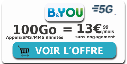 Avec ce forfait B&You à 13,99€ par mois, vous pourrez surfer sur le net à hauteur de 100Go, autrement dit en toute tranquillité, depuis la France métropolitaine. Cerise sur le gâteau, vous aurez l'opportunité de profiter de la 5G gratuitement au lieu de souscrire à l'option qui vous coûterait 3€ supplémentaires chaque mois.
