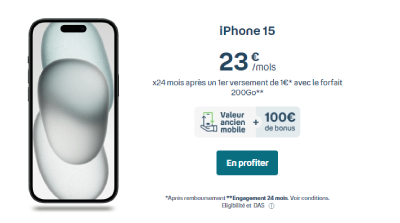 Au total, c’est donc une excellente affaire, puisque vous ne paierez que 1 € + 22,49 € par mois pendant deux ans ou 491,90 € au comptant (au lieu de 999 €) pour vous offrir l’iPhone 15. Vous voulez encore faire baisser la facture ? Alors, revendez votre smartphone actuel à Bouygues Telecom ! L’opérateur reprend votre ancien mobile et vous accorde même un bonus de 100 € pour cela. Bref, le bon plan idéal pour faire des économies supplémentaires !