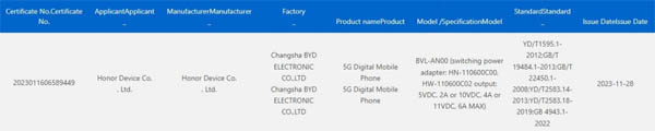 Actuellement, Honor propose le smartphone haut de gamme Magic5 Pro et il existe aussi un Magic5 mais que la marque n’a pas souhaité commercialiser en France à la différence du Magic5 Lite qui est disponible et plus abordable. Le Magic5 Pro porte le numéro de modèle PGT-AN10 alors que le Magic5 a le numéro de modèle PGT-AN00. Or, les listes du site web de certification de l’organisme 3C qui doit vérifier la conformité des appareils électroniques avant leur mise sur le marché viennent de mettre à jour un téléphone de la marque Honor qui porte le numéro de modèle BVL-AN00. Il pourrait s’agir du prochain Honor Magic6. Le rapport détaille les caractéristiques techniques de son chargeur. Celui-ci serait capable de proposer une charge maximale de 66 watts. Cela correspond aux mêmes caractéristiques que les chargeurs livrés avec les téléphones de la série Magic5 indiquant que la marque ne présenterait pas d’avancées significatives dans ce domaine à moins que la version Pro propose de supporter la charge jusqu’à 80 watts contre 66 watts aujourd’hui. Le Magic6 Pro porterait le numéro de modèle BVL-AN10, si on suit la même logique que la précédente génération.