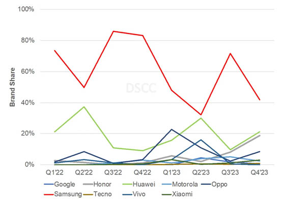 Le PDG de DSCC, Ross Young, a déclaré que l'année 2023 a été mitigée pour les smartphones pliants. « Elle a bénéficié du regain de Huawei et de sa part de marché significative, de nouveaux entrants tels que Google, OnePlus et Tecno, ainsi que d'améliorations impressionnantes de l'épaisseur des appareils, du poids et de la réduction de la visibilité des coutures. » M. Young souligne également que les expéditions d’écrans pliants concerneraient de moins en moins Samsung Display, au profit de son concurrent, BOE qui devrait prendre la place de premier fournisseur de panneaux pour le quatrième trimestre, grâce à Huawei, OPPO et Honor.