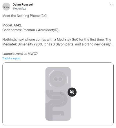 Des informations récentes ont émergé concernant le Nothing Phone 2a, pressenti pour être le prochain téléphone de la marque britannique. Cela demande à être confirmé, mais certains détails intrigants sur ce nouveau smartphone ont été divulgués par des personnes qui semblent très bien renseignées. Selon ces sources, le design du téléphone connaîtra des modifications notables, notamment au niveau de la caméra arrière et de l'interface des glyphes (les LED qui illuminent l’arrière de l’appareil). Plus intéressant encore, le processeur MediaTek Dimensity 7200 a été confirmé pour ce modèle, identifié sous le numéro A142 et les noms de code Pacman/Aero.