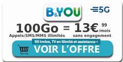 Pour profiter de tous ces avantages sans verser le moindre centime supplémentaire, il vous faudra souscrire au forfait B&You 100Go. Ce forfait est sans engagement, vous laissant libre de résilier votre abonnement de téléphone mobile à tout moment et sans frais. À 13,99€ par mois, vous pourrez naviguer sur la toile à hauteur de 100Go de 5G en France métropolitaine et apprécier l'illimité pour vos appels, SMS et MMS.