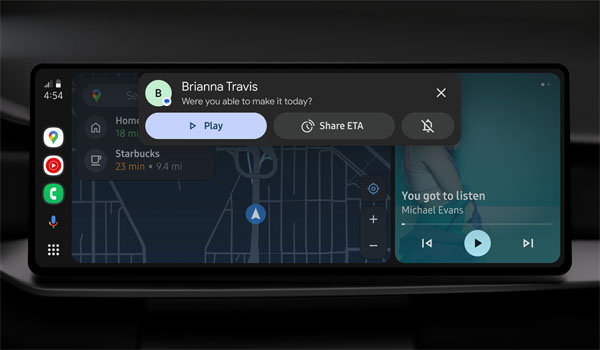Enfin, grâce à l'intelligence artificielle, Android Auto simplifie désormais la gestion des communications en voiture. Lorsque vous êtes au volant, l'application réduit les distractions en condensant automatiquement les messages longs ou les échanges intenses dans les groupes de discussion. Ainsi, rester en contact devient plus sûr sans compromettre votre attention sur la route. Android Auto propose également des suggestions intelligentes pour des réponses et des actions, accessibles d'un simple geste, sans avoir à manipuler votre téléphone. Par exemple, si vous devez rejoindre un ami dans un lieu qu'il a partagé, une simple pression sur l'adresse déclenche le guidage GPS, et votre heure d’arrivée estimée peut être envoyée automatiquement. Vous avez même la possibilité d’appeler votre ami directement depuis l'interface.