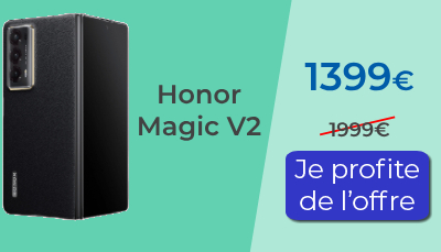 Le Honor Magic V2, disponible en coloris noir similicuir et violet, est proposé en précommande en France à partir du 26 janvier 2024, au prix de 1999 €. Une réduction de 600 € est offerte du 26 janvier au 14 février, et pour tout achat, une enceinte Marshall Stanmore III d'une valeur de 399 € est incluse jusqu'au 25 février.